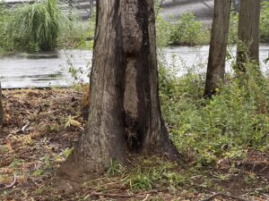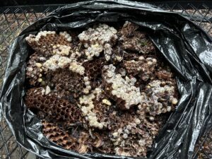 1メートル近く木の内部へ巣が続いている為、びしゃびしゃになりながらも木の内部をほじくりまわし戻りバチを倒しながら回収します💦